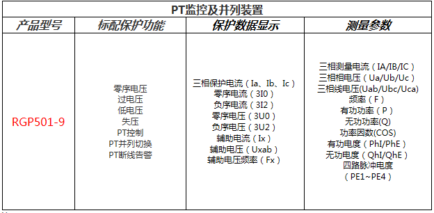 • RGP501-9是集保護(hù)、測(cè)量、監(jiān)視、控制、人機(jī)接口、通信等多種功能于一體的PT保護(hù)監(jiān)控裝置,適用于各種PT單元測(cè)控及PT切換;